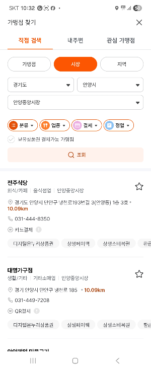 그래서 저는 주로 주말에 장을 보러 가는 '안양중앙시장'에서 대부분의 금액을 사용했습니다. 안양시장은 '직접 검색'으로 찾아보면 거의 모든 점포가 가맹점이라, 따로 사용처를 찾을 필요 없이 그냥 등록한 카드로 결제만 하면 되니 정말 편했습니다.
