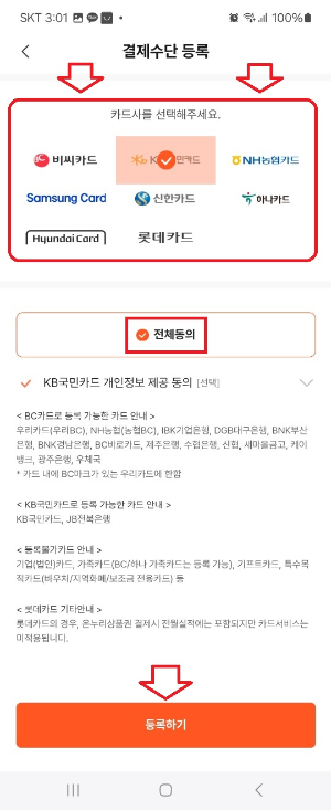 카드사를 선택하고 전체 동의를 누른 뒤, 카드 번호를 입력하면 등록이 완료됩니다.