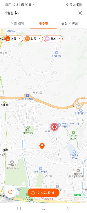사실 저는 안산에 거주하고 있지만, 정작 안산에서는 아는 가맹점이 집 앞 마트 1곳뿐입니다. 앱으로 '내 주변' 조회를 해봐도 제 생활 반경과는 거리가 멀더군요.